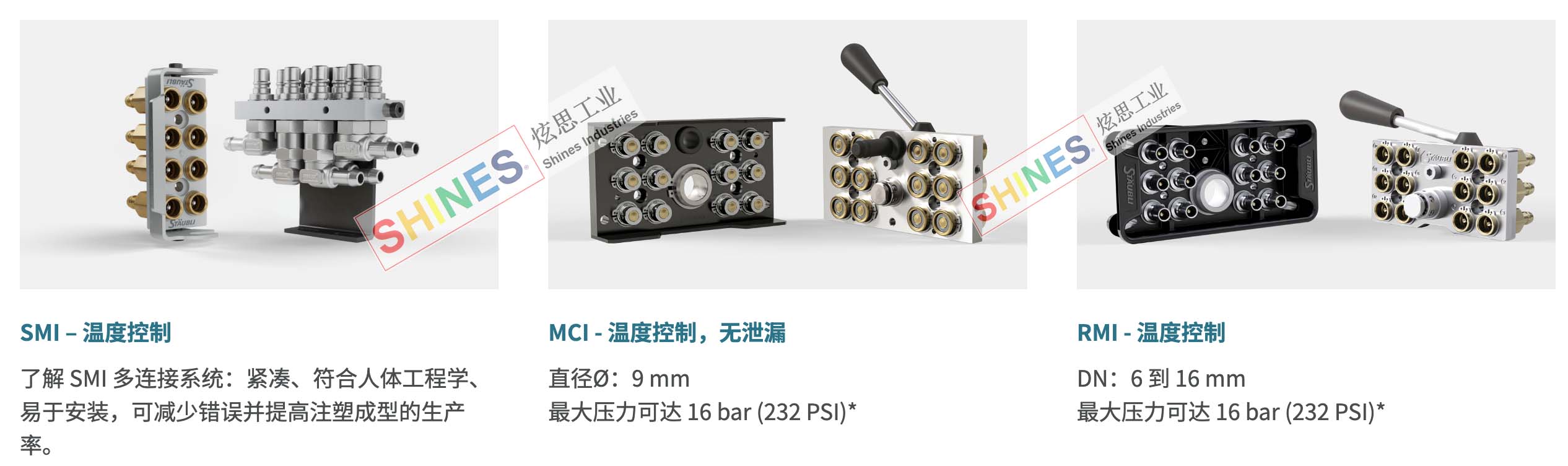 The SMI multi-connection system is compact, ergonomic, and easy to install. It reduces connection errors and improves productivity in injection molding applications.